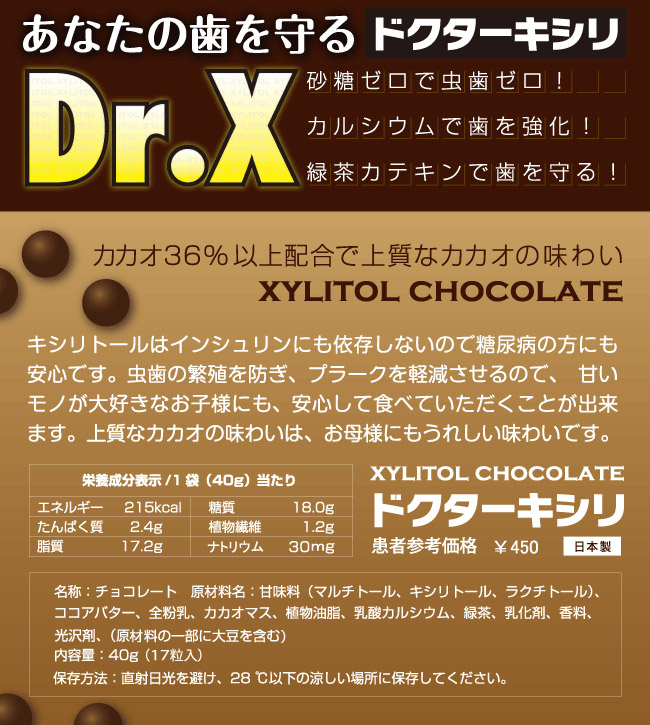 チョコレートなのに、虫歯予防! 甘いものが大好きなお子さんにも、カロリーが気になる女性にも、忙しくて昼食後の歯磨きが難しい方にもオススメなチョコレート『ドクターキシリ』しつこい甘さはなく、さらりとした、甘さ控えめのチョコレートです。 450円で販売中です!ぜひお試しください!