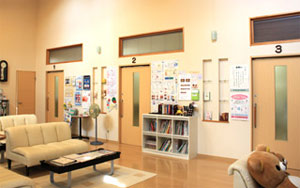 入口には、階段の他に、スロープもあり大きな駐車場も完備しております。また、夏は冷たいお茶、冬は温かいお茶もご用意してございます。週刊誌、ファッション誌、絵本もございますので、どうぞ診察後もおくつろぎください。